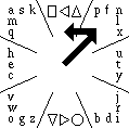 In the case of f, the first arrow points from zone 5 to zone 3, and the second arrow points from zone 3 to zone 2. If you move the mouse along this path, and then back to the center again, (5 -> 3 -> 2 -> 5), then the letter 'f' will be printed in the rightmost square.